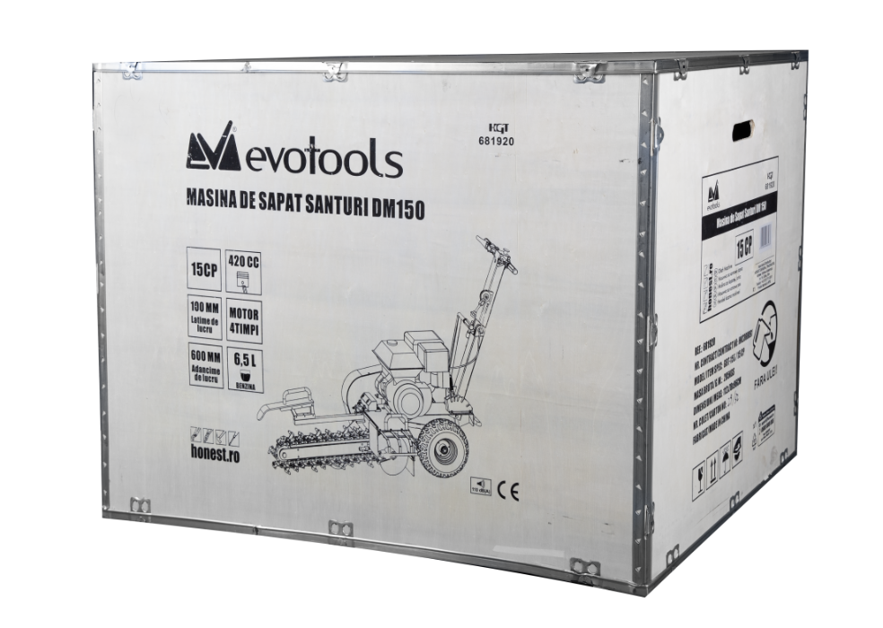 A DM150 árokásó gép erős és megbízható 15 CP motorral van felszerelve. Ajánlott csövek és kábelek számára árkok ásásához, nagy méretű gumigumikkal szerelve, amelyek megkönnyítik a mozgást egyenetlen terepen.